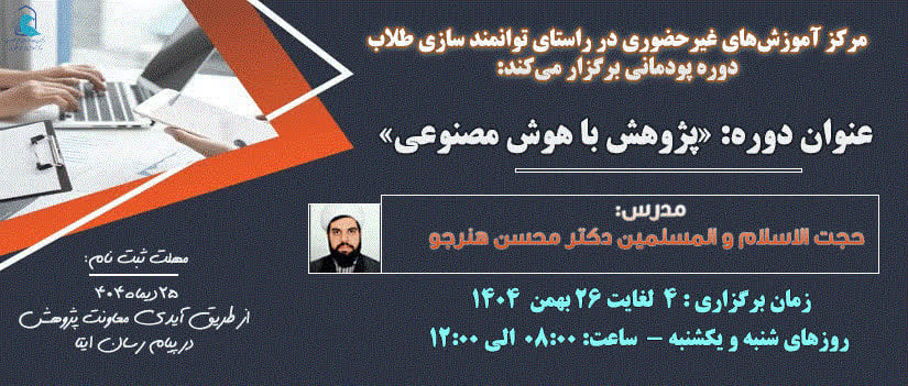 🔔معاونت پژوهش مرکز آموزشهای غیرحضوری در راستای توانمند سازی طلاب در استفاده از روشها و ابزارهای جدید پژوهشی و تاثیر آن در تسریع و تسهیل نوشتن #پایاننامه، در نظر دارد #دوره_پودمانی با عنوان "پژوهش با هوش مصنوعی" را بهصورت برخط برگزار نماید.