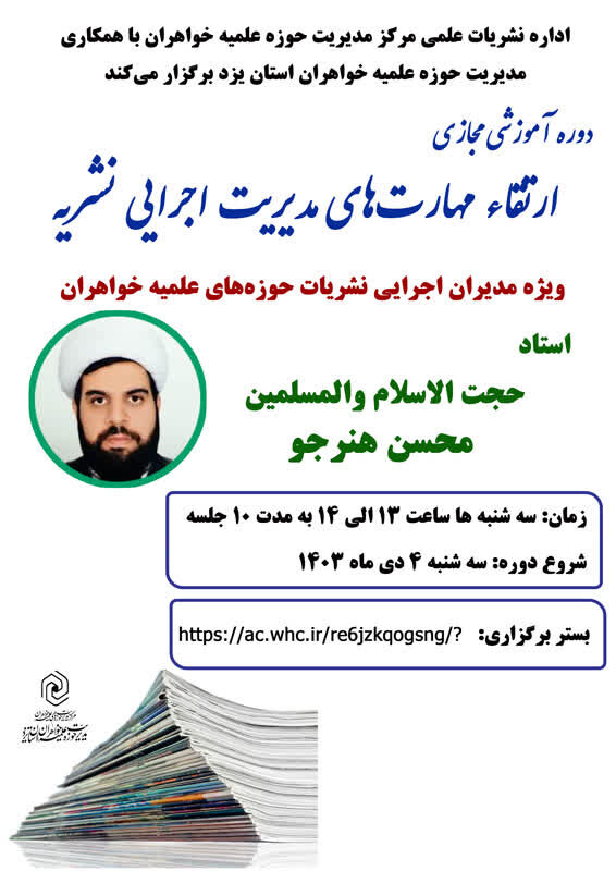 به گزارش خبرنگار خبرگزاری حوزه از یزد، حجت الاسلام و المسلمین محسن هنرجو در دومین جلسه کارگاه مجازی با مدیران اجرایی نشریات، یکی از ارکان اصلی نشریه را صاحب امتیاز نشریه دانست و اظهار داشت: صاحب امتیاز نشریه برای اخذ رتبه علمی، باید هیأت تحریریهای متشکل از حداقل هفت نفر از صاحبنظران در حوزه موضوعی نشریه را که کتباً قبول مسئولیت نموده اند، مطابق استاندارد هیأت تحریریه معرفی نماید.